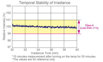 ![]() | 均勻性 在350-1800nm的范圍內(nèi),1太陽(yáng)的計(jì)算值大約是94.4 mw/cm。 工作距離:大約220毫米可以通過光強(qiáng)度控制來調(diào)節(jié)由燈壽命引起的光強(qiáng)度下降。超過A類區(qū)域的大小是參考值。請(qǐng)注意,燈的輸出因制造批次而異。它需要分別檢查光強(qiáng)度。 |