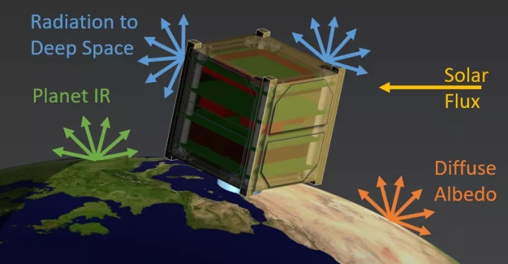 其次,對于近地軌道上的衛(wèi)星,入射到地球日光側(cè)的太陽光通量會被漫反射到衛(wèi)星朝向地球一側(cè)的表面。這些反射的大小取決于地球的局部表面特性以及不斷變化的大氣條件??偟膩碚f,漫反射太陽光通量大約是直接太陽光通量的三分之一,被稱為反照率通量。當衛(wèi)星進入日食時,這些直接的太陽光通量和反照率載荷下降為零,但有一個第三環(huán)境熱源始終存在。地球是溫暖的,相當于一個漫射器,其紅外輻射的大小是緯度和經(jīng)度的函數(shù)。知道這些隨時間變化的環(huán)境通量,以及它們在衛(wèi)星表面的分布,是計算衛(wèi)星溫度所需要的輸入,這涉及到求解固體部分的熱傳導和所有暴露表面的輻射。通常將這些環(huán)境通量分為兩個波段:太陽波段和環(huán)境波段。