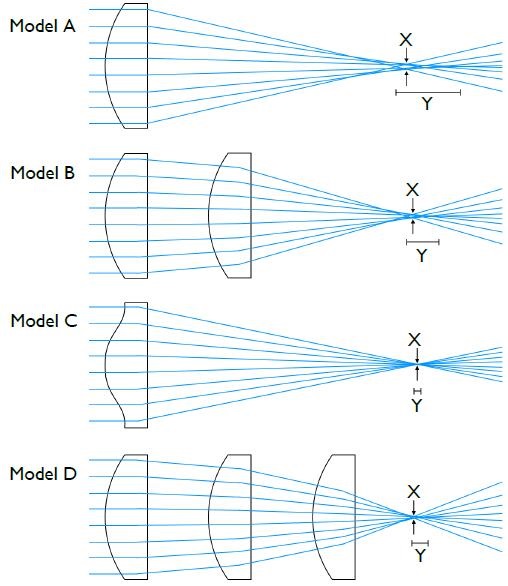 | -C | Varies | BK7 | 360-2500nm | Aspheric system for maximum throughput and minimal spherical aberration with a 1 lens system. | |