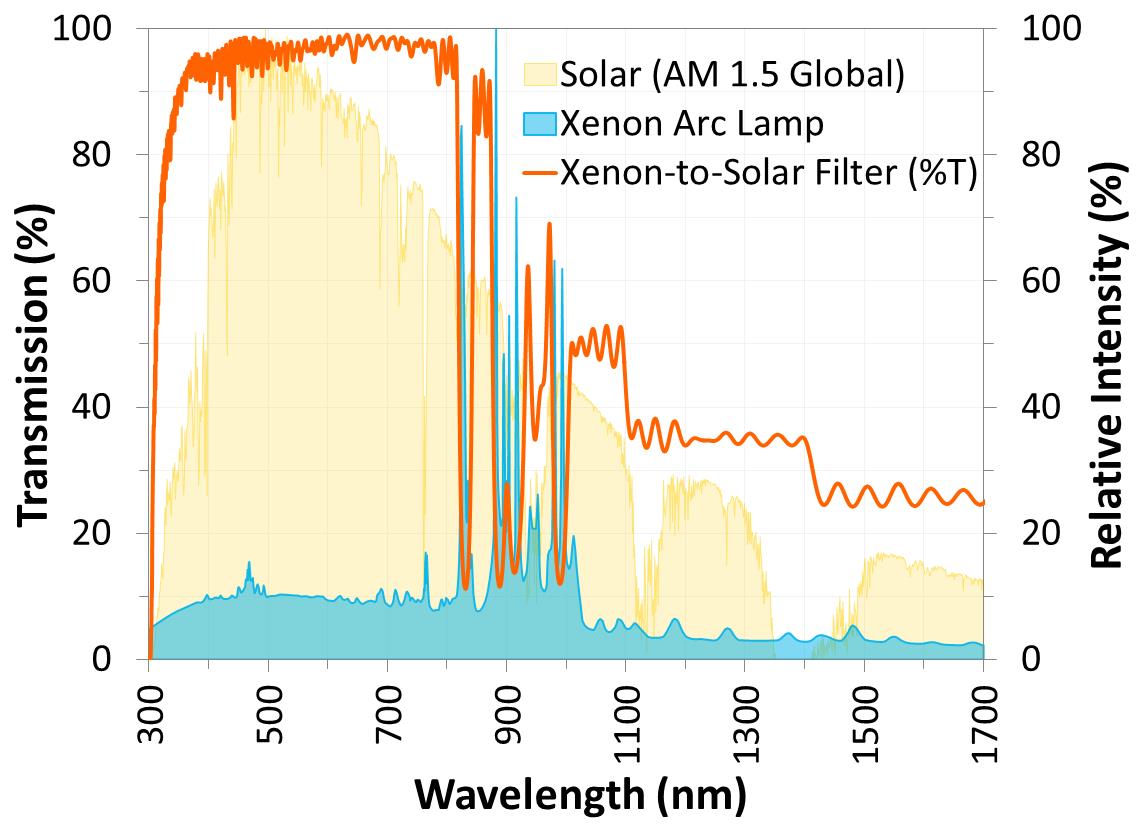 圖1.獨特的定制光學濾光片,旨在塑造氙弧燈的光譜,使其與太陽光相似。