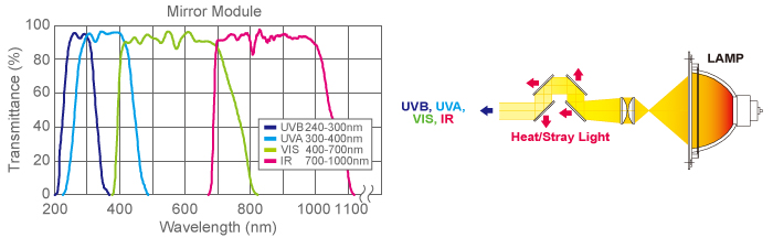 該組件由四個冷面鏡組成,用來阻擋氙燈多余的熱量,獲得期望的光通量。LAX-C100有4種類型的鏡面模塊。